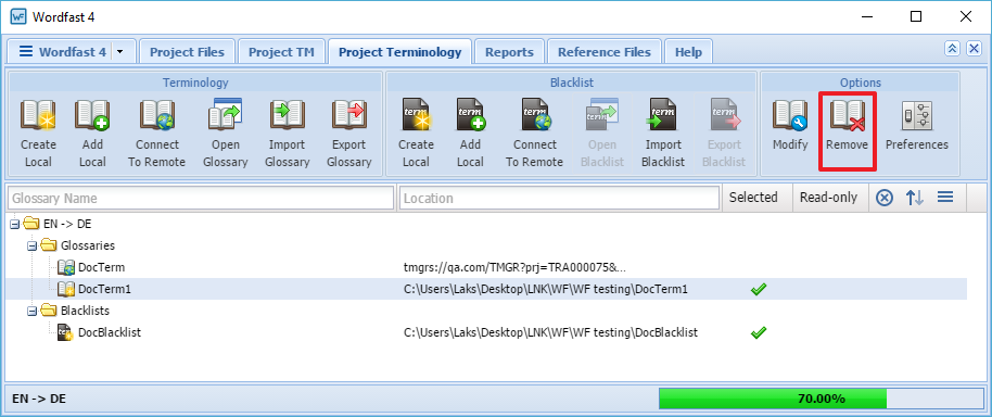 When a glossary is removed from a project, the local glossary file is retained in the glossary folder on your computer and can be added again by clicking on Add Local. The remote glossary can be added again by clicking on Connect To Remote and entering the URL.