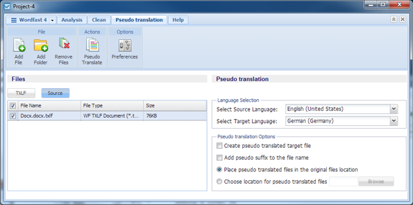 Pseudo translation copies the source content to a target where the content has accented characters and the text is expanded by twenty percent. The pseudo translation provides a preview of what content will be selected as translatable and how complex formatting appears in the target. Both source files or TXLF files can be pseudo translated.