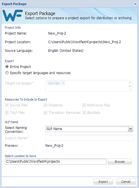 A GlobalLink Package (GLP) of project files comprises everything required for a project. Using the Export Package option, a complete project package can be shared with other Wordfast Pro installations without requiring a manual setup of the project on the receiving Wordfast Pro.