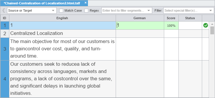 Multiple files can be combined and viewed as one file using Chain Files. For example, if you are translating ten files with ten segments each, these files can be chained into one file of 100 segments.