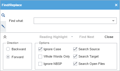 Text in translated content can be searched for and replaced using the Find/Replace option.