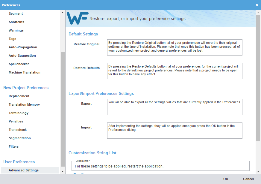 Advanced Settings preferences control the means to restore a Wordfast Pro installation to factory or default settings, migrate preferences between computers, and customize strings.