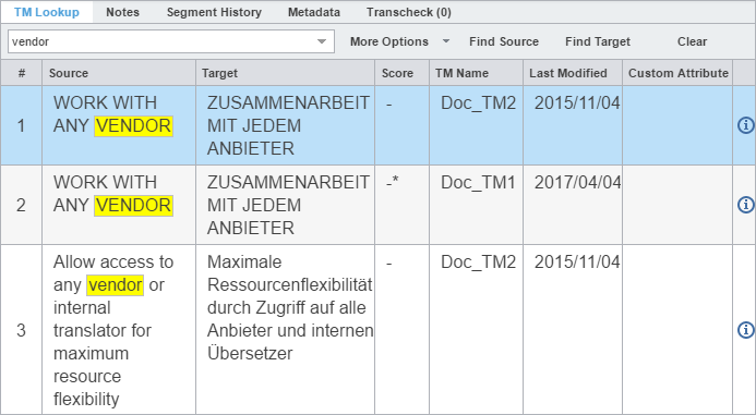 The refined search results for the word or phrase you selected are listed on the TM Lookup tab of the Editor pane. You can use the results of your search in the related target segments.