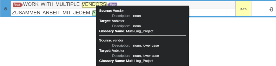 This highlights and adds a border around the source and target terms. Synonyms display on a temporary pop-up pane and on the Terminology pane.