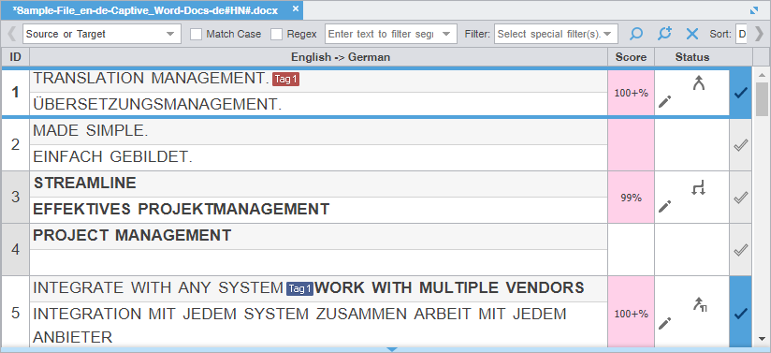 The segment is merged or split and the segment Status column contains either or , respectively. If the merge includes an entire paragraph, this is denoted with .