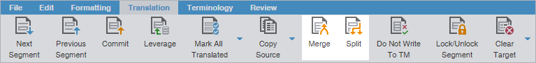 1. In the TXLF Editor view, and on the Translation tab, select the segment to split or merge.