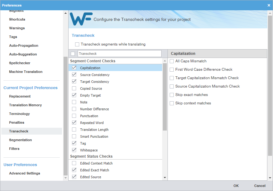 Transcheck preferences control how Transcheck verifies target segments and issues warnings about common translation errors within a project. For example, if a translated term conflicts with the designated glossary,