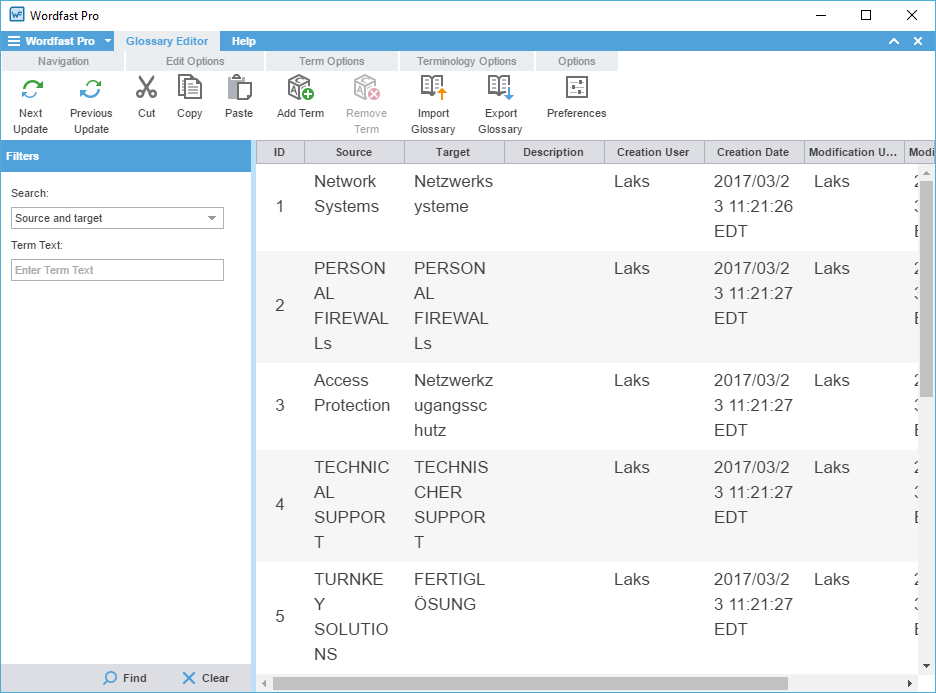 The Glossary Editor dashboard is displayed. You can filter, view, add, remove, and update terms in a local glossary using the Glossary Editor.
