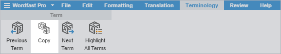 The translation of the selected source term is copied into the target segment.