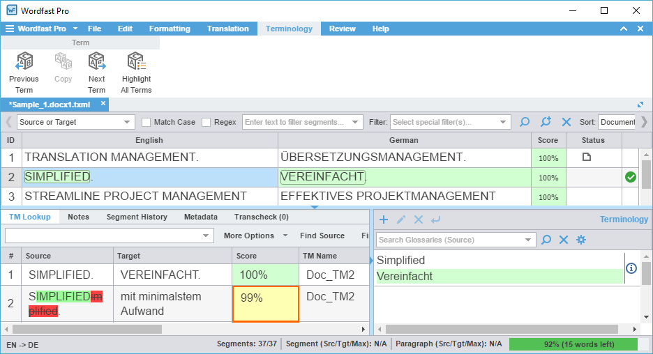 When you select a segment, Wordfast highlights all terms within that segment that are in the terminology list or glossary and displays the translation in the Terminology pane.