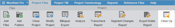 After you have translated project files, it is time to clean them up and update the translation memory (TM). The clean up action converts the bilingual TXLF files into translated target files with the file format of the source.