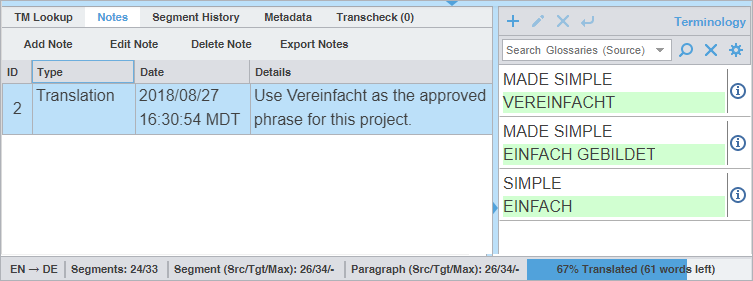 The Notes tab is on the Editor pane. Notes retain the same ID as the related segment.