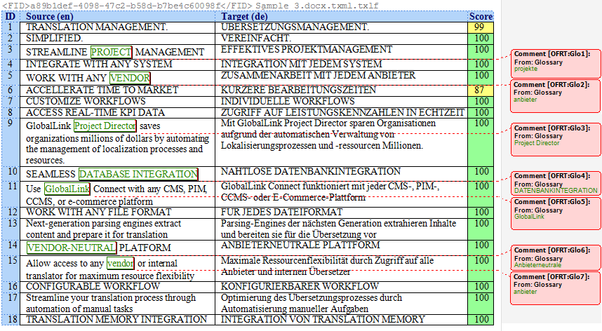 Use Bilingual Export to export the TXLF file with highlighted glossary terms into a .DOC or .DOCX format. This allows you to edit and spell check the file using Microsoft Word, rather than the internal spell check. You can also complete a bilingual export or import outside the Project List view using Quick Tools.
