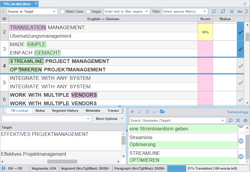 Segment selection highlights terms from the terminology list on the Terminology pane along with potential translation options.