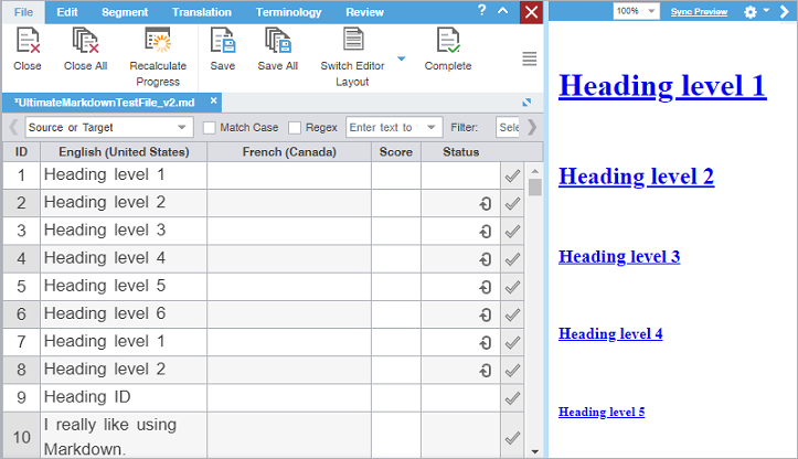 In TXLF Editor, on the File tab, click Preview, then select Live Preview, Office Preview, or Html Preview from the drop-down menu. Live Preview works with Word, PowerPoint, or Markdown files. It opens a preview of the target content for comparison to your source content. If you click on a line of text in the preview document, your cursor will move to that segment in the TXLF file. Office Preview will open a PDF preview of the current translation file. Html Preview will open a preview as an HTML file, only if the source file was HTML. Another option is to click Preview File, and a translated file will open if the source is available. |