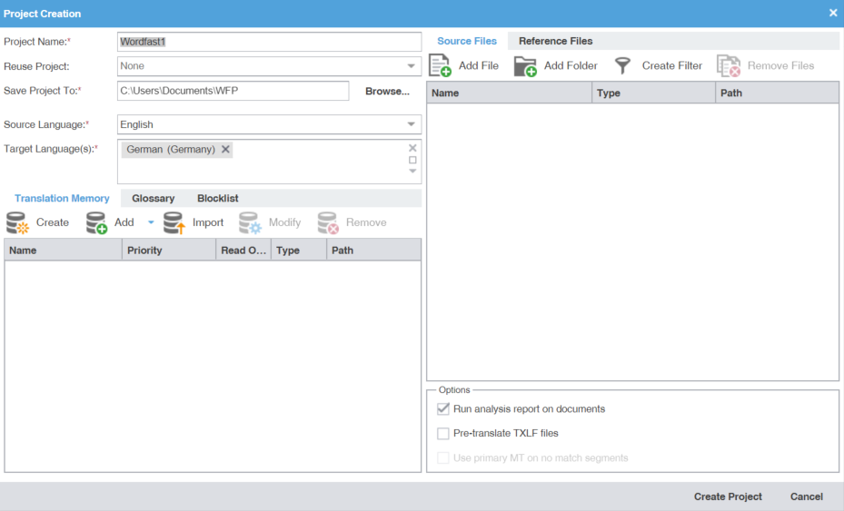 Unlimited TM and glossary access — Accesses an unlimited number of TMs and glossaries simultaneously and prioritizes as primary or secondary.