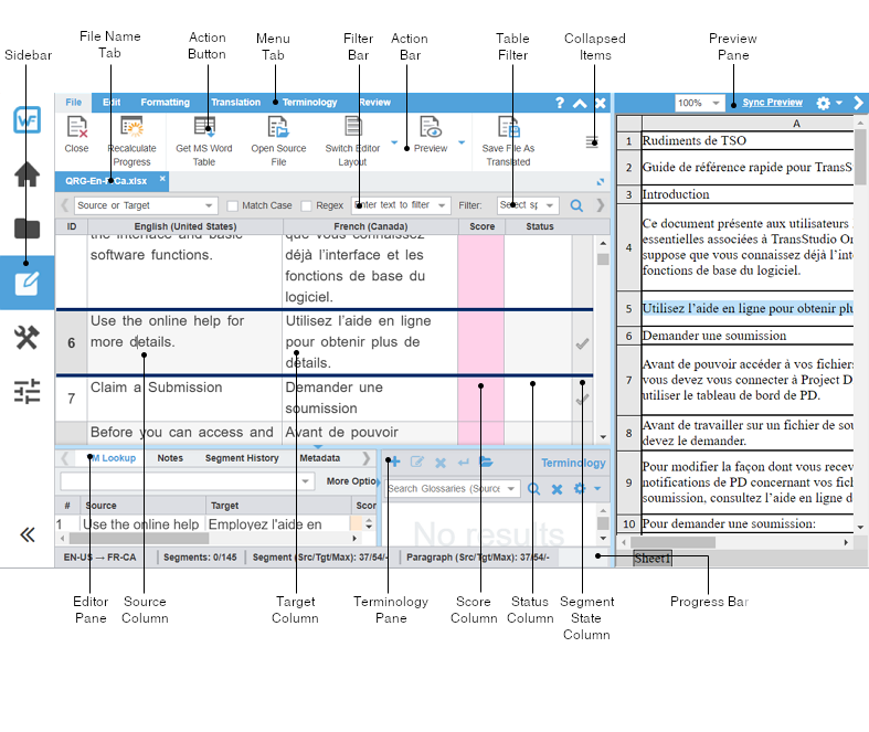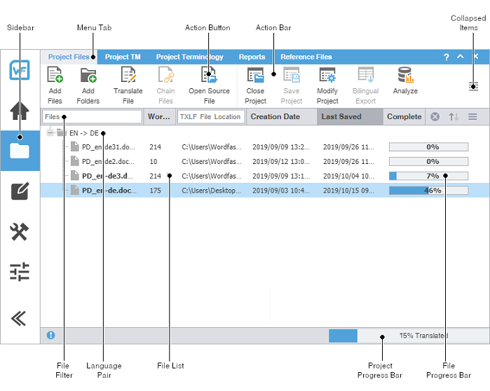 Wordfast Pro uses a Sidebar to navigate among views. Click the icons to change from one view to another.