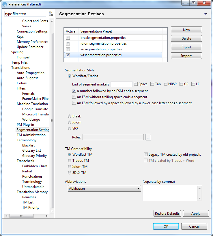 The Wordfast Pro workspace (.wf_workspace folder) includes a number of default properties files that are used for file segmentation. You can either use the default properties files or export and edit these files.
