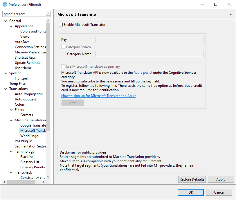 Enter a Key, which is mandatory to use Microsoft Translate. Click the How to sign up for Microsoft Translator on Azure link for more information.